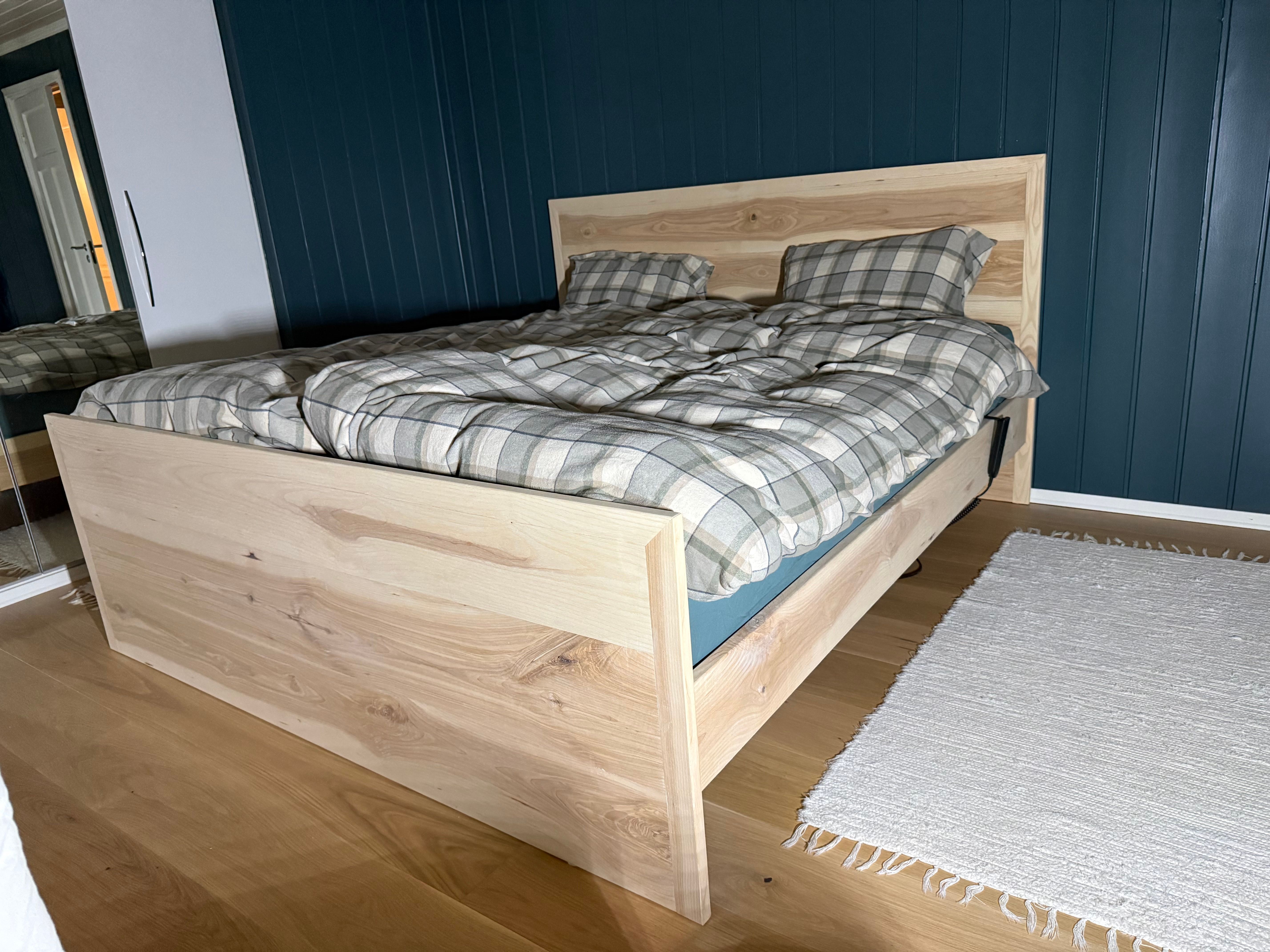 Dobbeltseng i heltre Ask fra egenhogget Aske-tre hos svoger Arild på hans småbruk