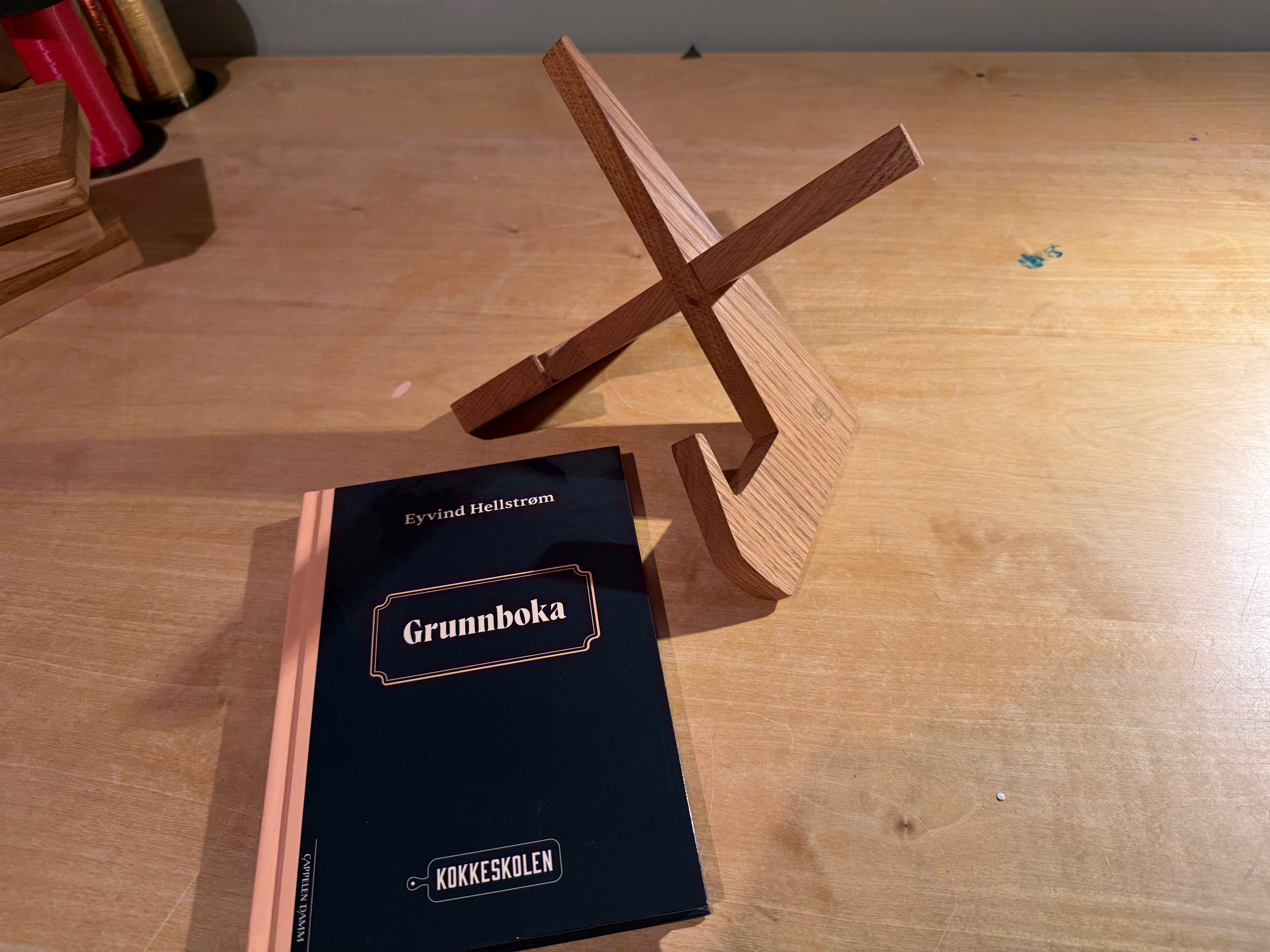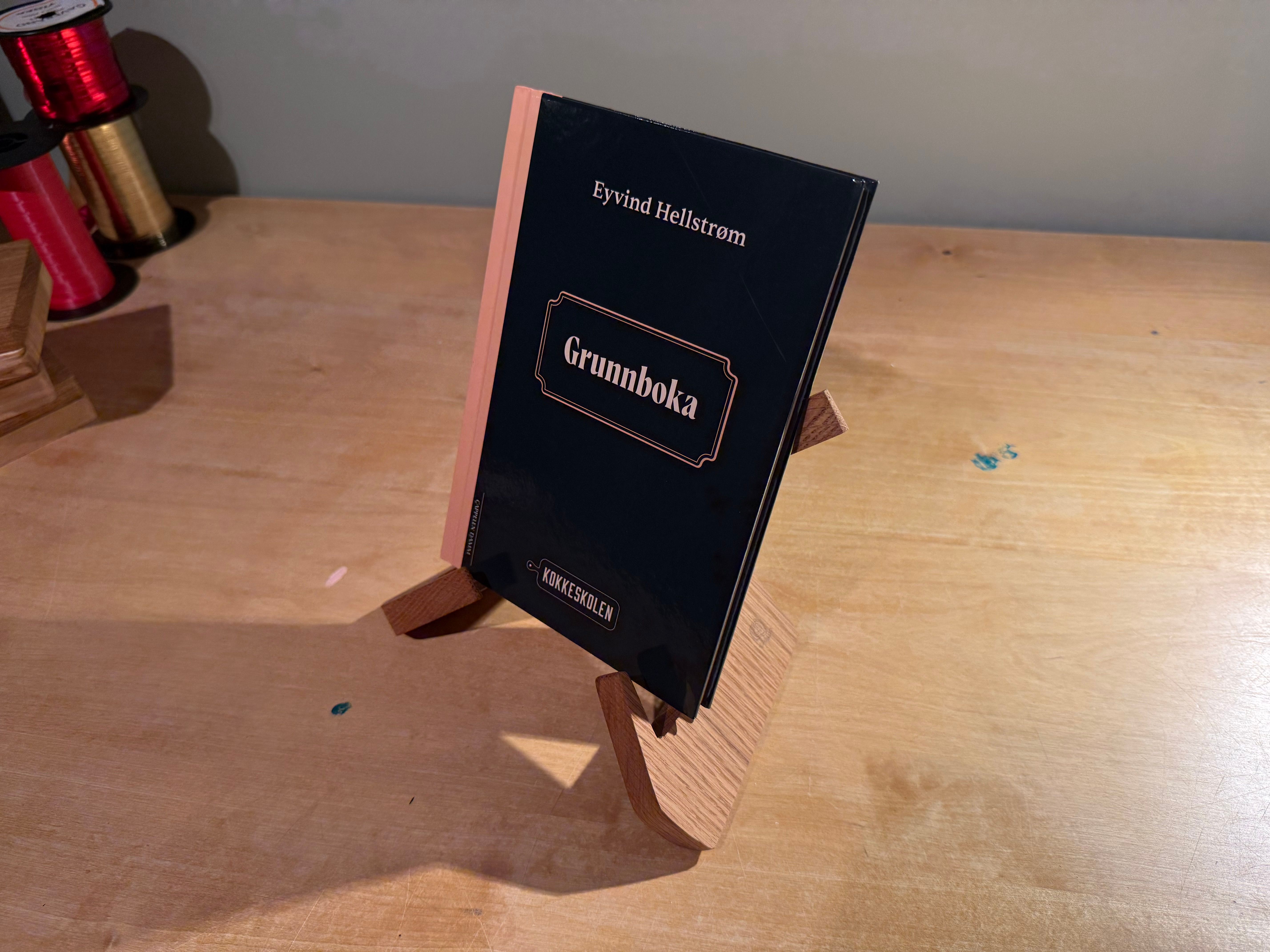 Stativ i eik til å holde kokebok oppslått på kjøkkenbenken