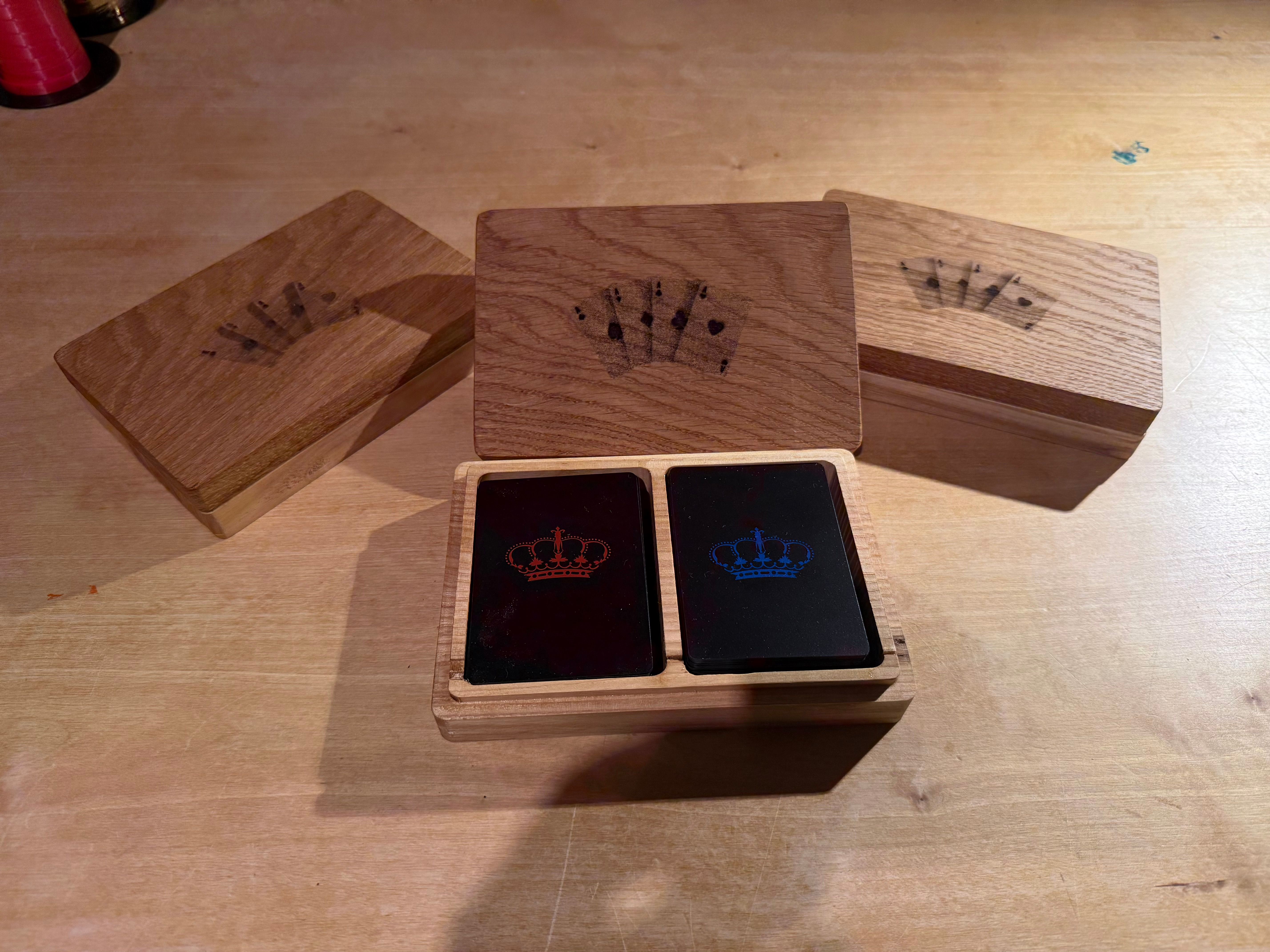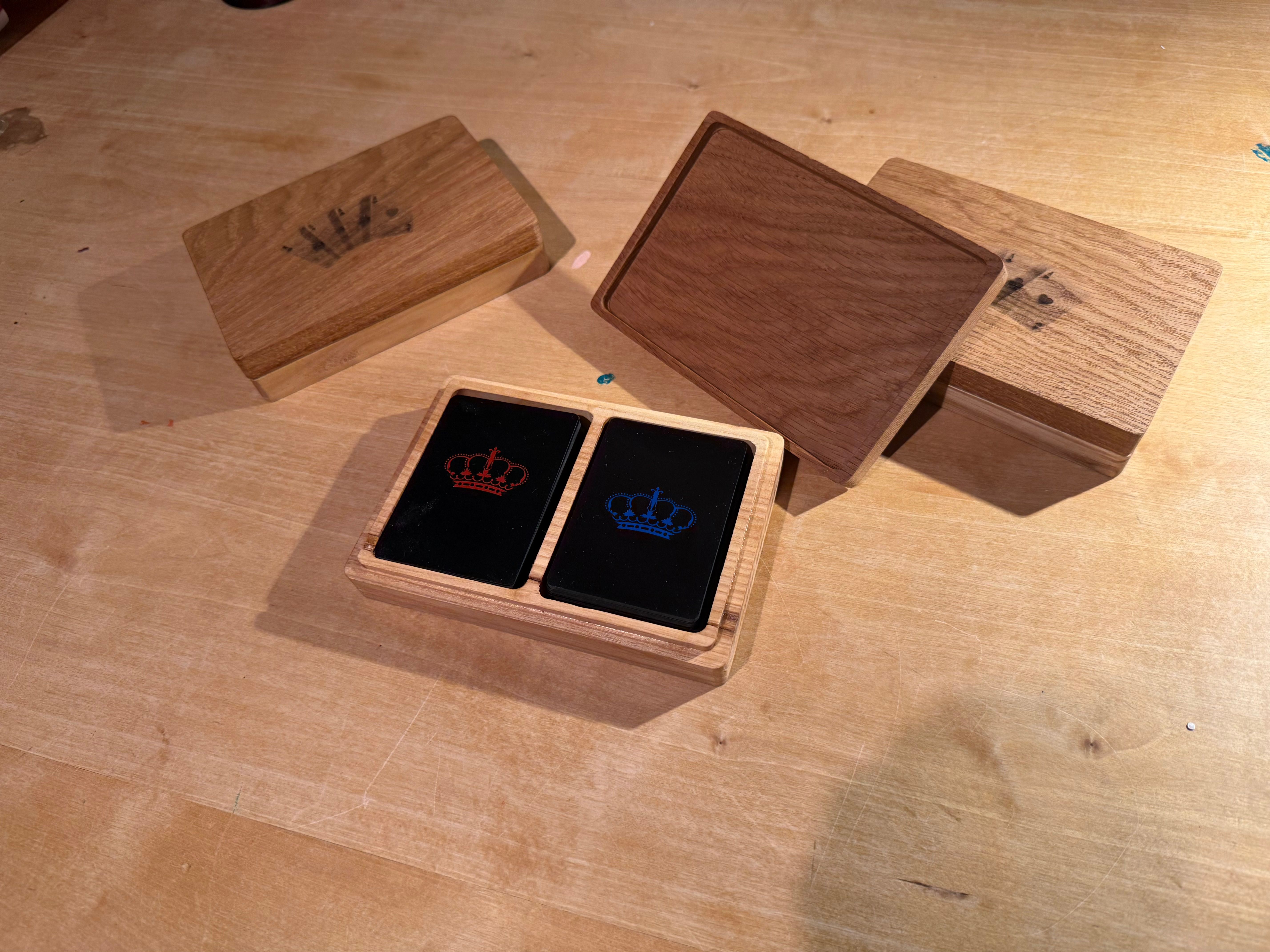 Oppbevaringsbokser til kortstokker. Lokk i materialer av Eik og bunn laget av Ask