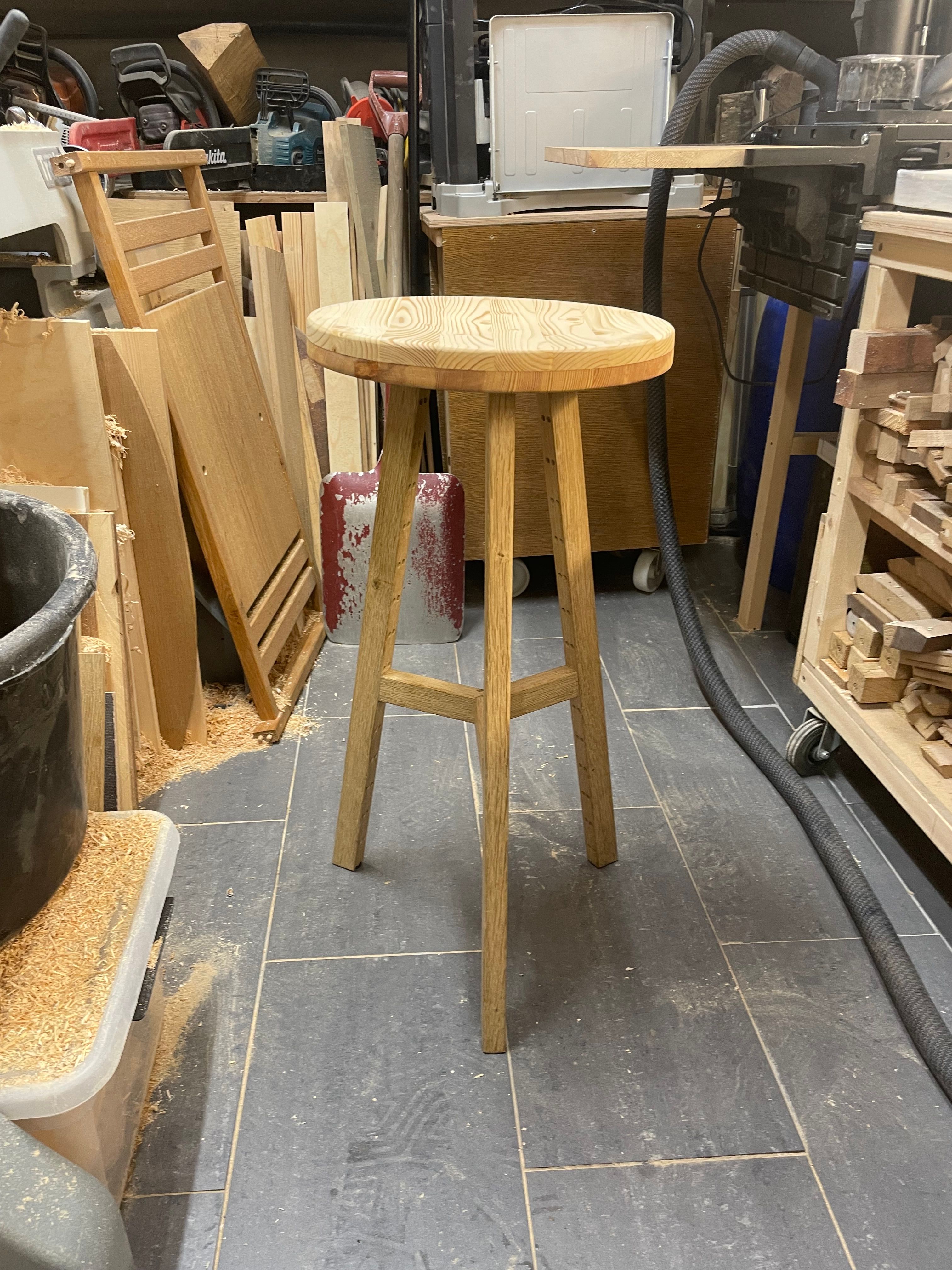 Trebent og stødig krakk til snekkerboden laget av restmaterialer. Knutepunktet mellom bena er det sentrale punktet som gjør krakken stødig og solid.